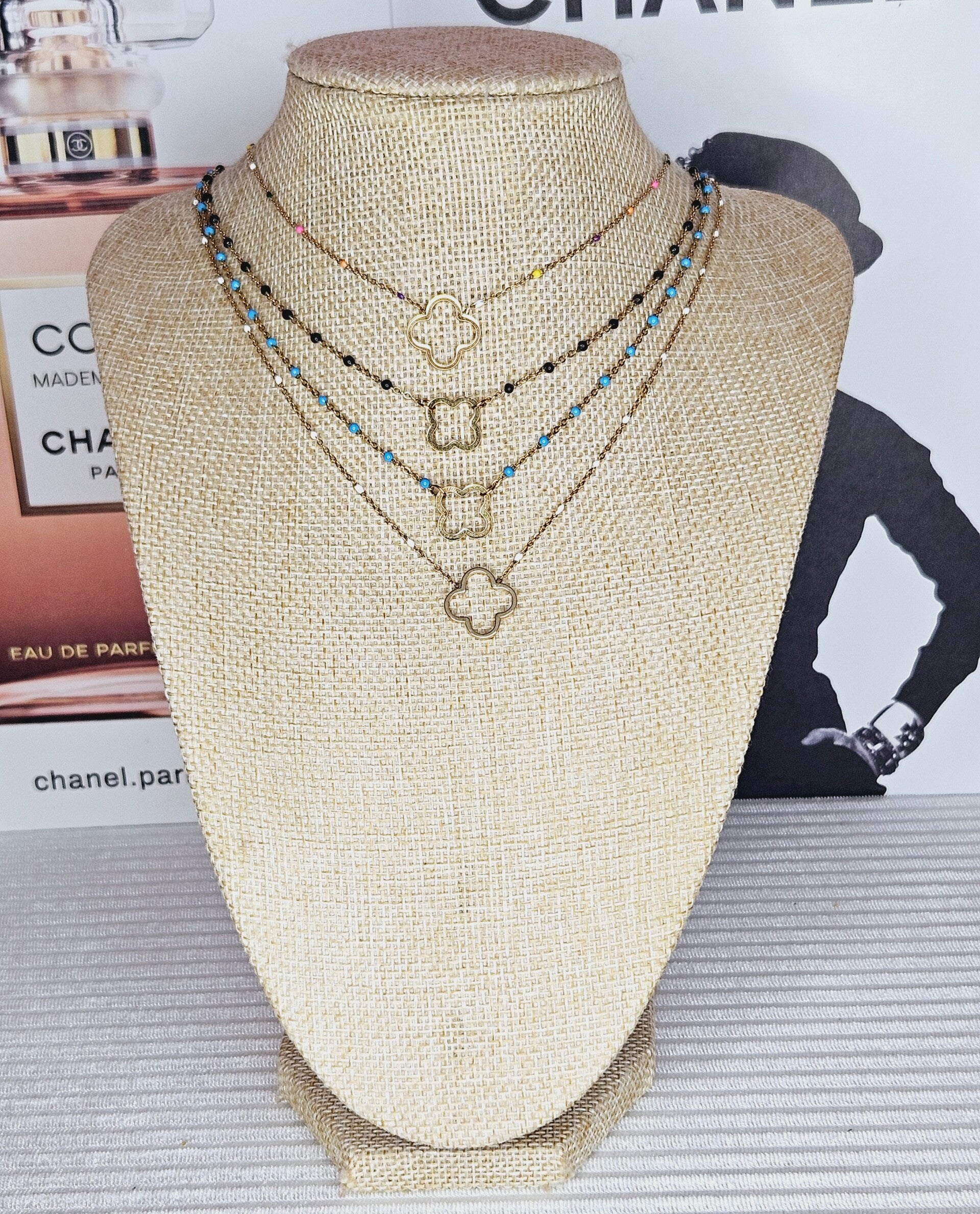 🌺 Superbe collier "Julia " de couleur doré avec détail Trèfle "Van Cleef " 😍 avec des petites perles de couleurs :