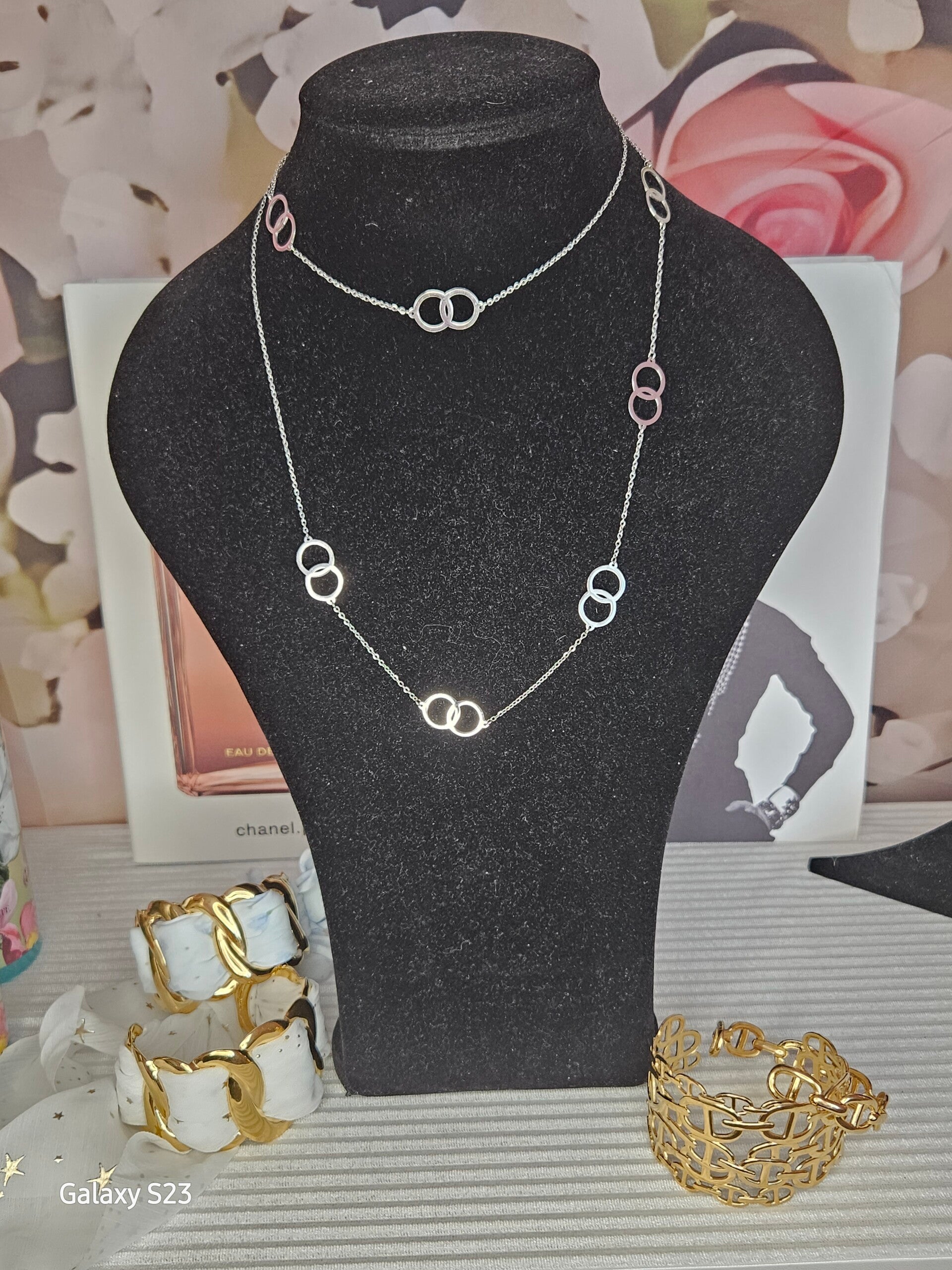 ✨️ Très tendance , se sautoir " Claudine" habillera parfaitement votre petite tenue du jour....longt de couleur argenté avec détails petites cercles entrelacés...
