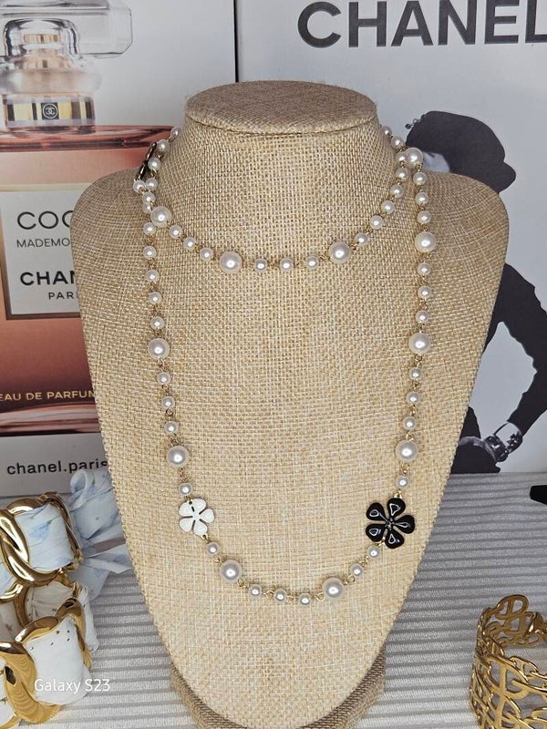 ✨️ Magnifique collier sautoir longt de couleur doré avec perles blanche nacré est trèfles de couleur noir....