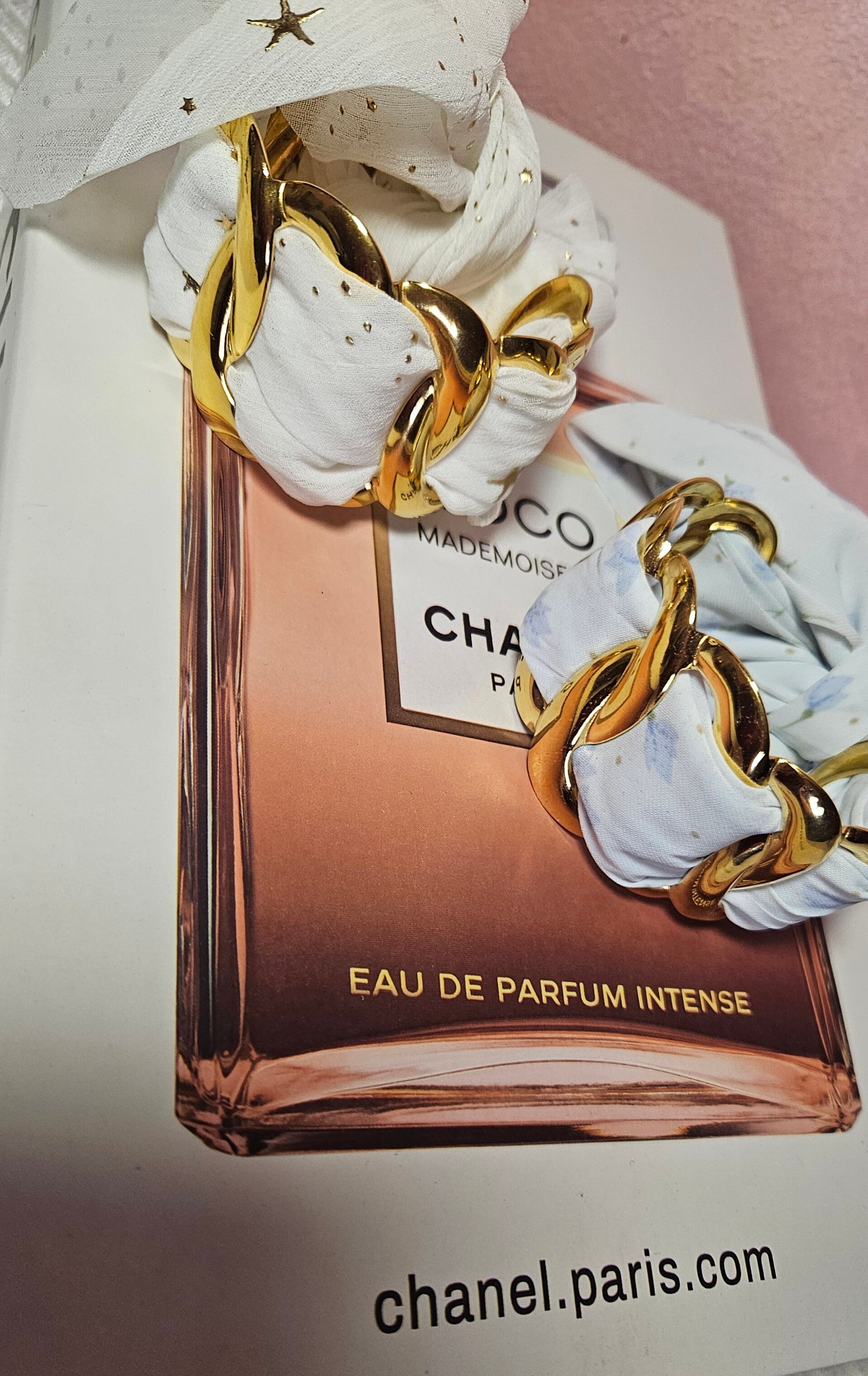 ✨️ Un gros bracelet jonc ouvert doré, qui accueille un foulard délicat glissant à l’intérieur : blanc parsemé de petites étoiles dorées ou bleu ciel décoré de fleurs légères.