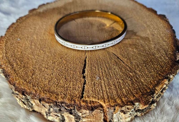 ✨️ Un jonc raffiné de 6,5 cm de diamètre, disponible en blanc nacré avec de délicats détails maille marine ou en noir profond.