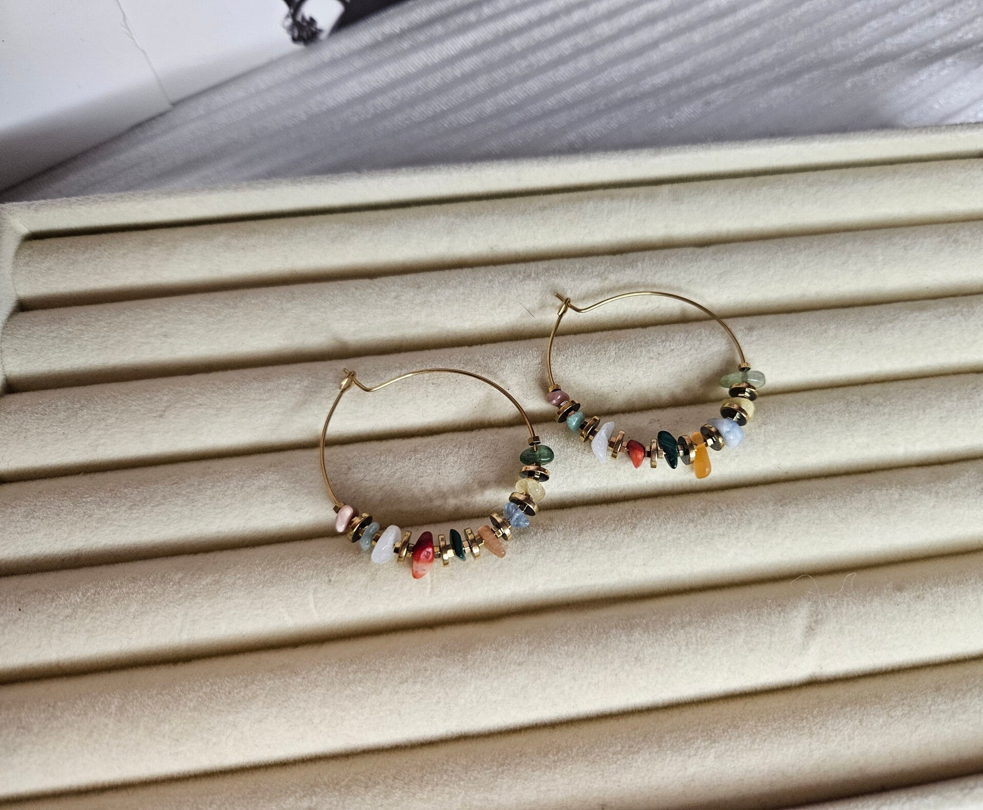 ✨️ Très belle paire de boucle d'oreille ronde, créole de couleur doré avec pierre de couleur naturelle...