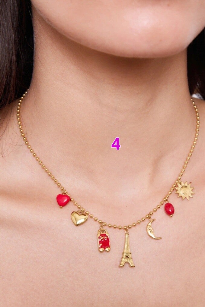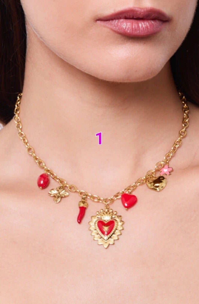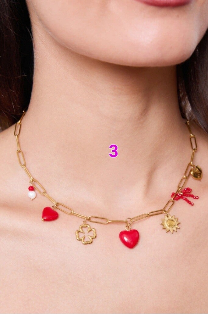 ✨️ Superbe collier doré orné de breloques rouges, symboles de l’amour et de la passion ✨