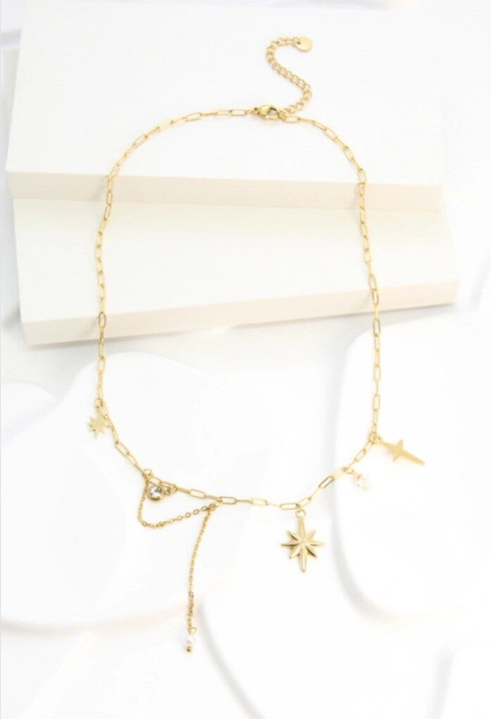 ✨️ Élégant et lumineux, ce collier en acier inoxydable doré est orné de charms raffinés : étoile à huit branches, petite étoile dorée, croix stylisée, perles nacrées et strass scintillant. Sa chaîne à maillons fins et son pendentif en étoile en font un bijou tendance, idéal pour apporter une touche chic et subtile à vos tenues. Ajustable et résistant, il se porte aussi bien au quotidien que lors d’occasions spéciales.✨️
