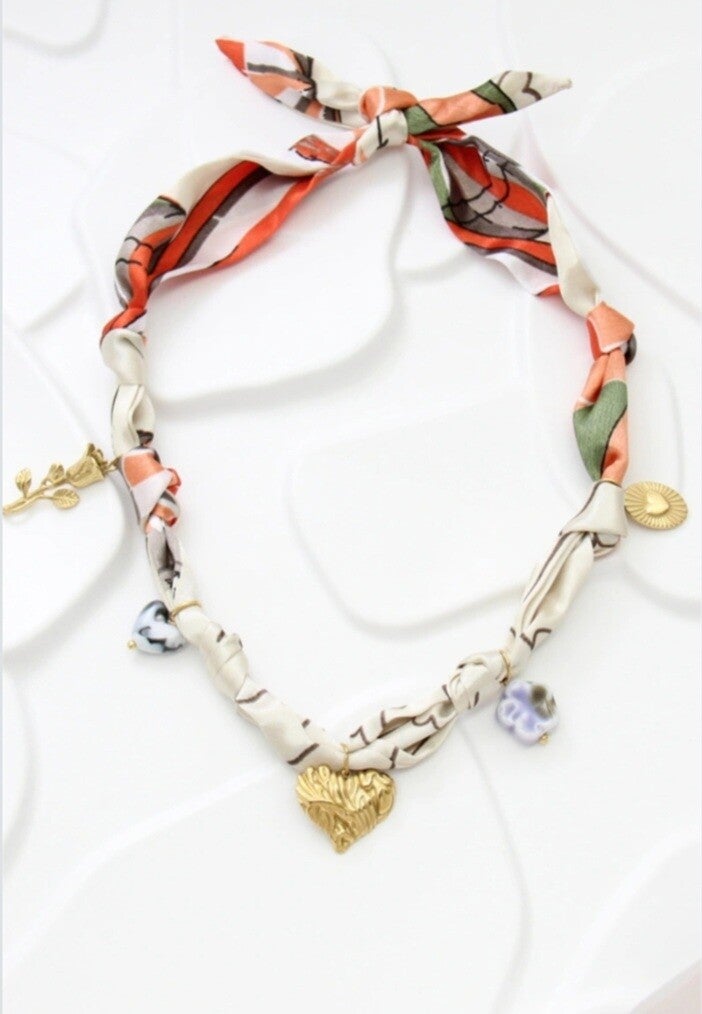 ✨️ Un collier original mêlant foulard coloré et charms dorés. Léger, tendance et facile à nouer, il ajoute une touche bohème chic à vos tenues estivales.✨️