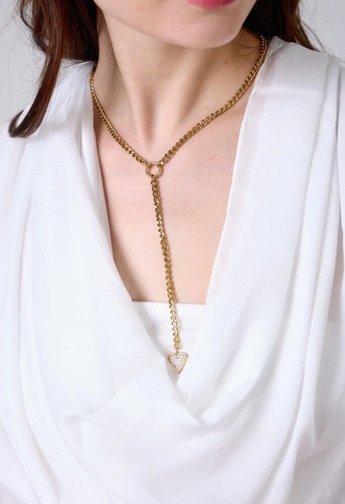 Collier doré en Y – Chaîne épaisse & pendentif cœur strassé