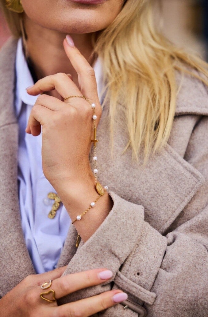 ✨️ Un bijou raffiné au style spirituel et élégant. Ce bracelet de main est réalisé en acier inoxydable doré et orné d’une médaille religieuse ovale et d’une croix délicate. La chaîne fine est ponctuée de petites perles blanches qui apportent une touche de douceur et de luminosité. Acier inoxydable doré, durable et hypoallergénique Médaille et croix finement travaillées Détails en perles blanches élégantes Chaîne ajustable pour un confort optimal Un accessoire intemporel qui allie foi, élégance et modernité, parfait pour un style unique et symbolique.✨️