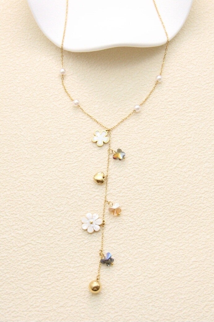 Collier Long Fleurs et Perles – Acier Inoxydable Doré