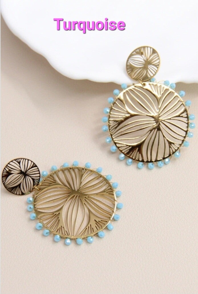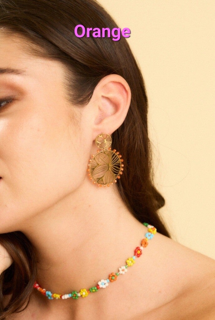 Boucle d'oreille fleur filigrane orné de perle en acier inoxydable.
