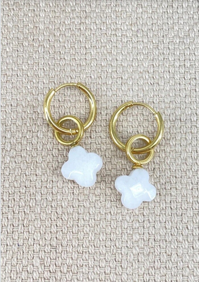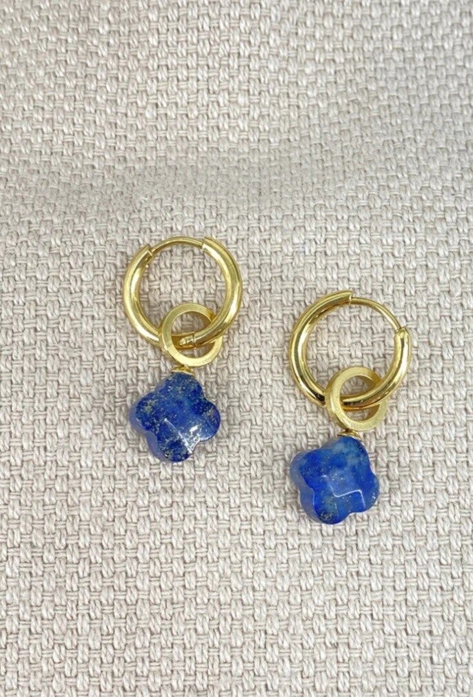 Craquez pour ces petites créoles dorées ornées d’un pendentif trèfle décliné en blanc nacré ou en joli bleu lumineux 💙🤍.