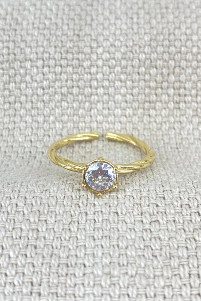 Laissez-vous charmer par cette magnifique bague dorée, au design tressé élégant et ornée d’un superbe zircon blanc étincelant.