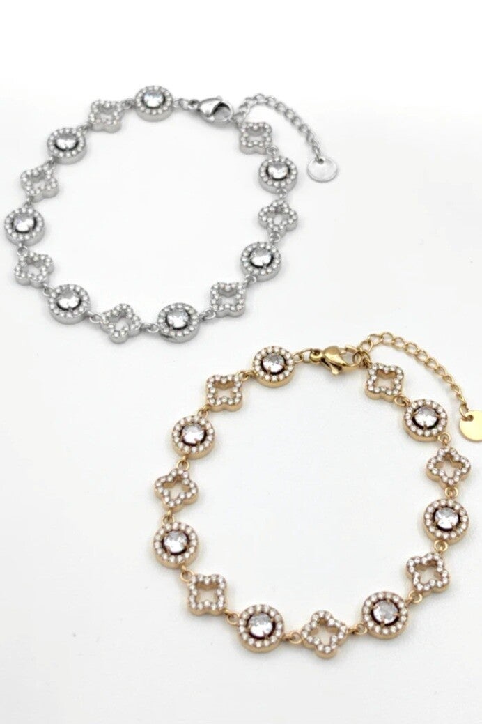 Bracelet ajustable en acier inoxydable avec motifs alternés : rond avec circon blanc / trèfle strass ✨