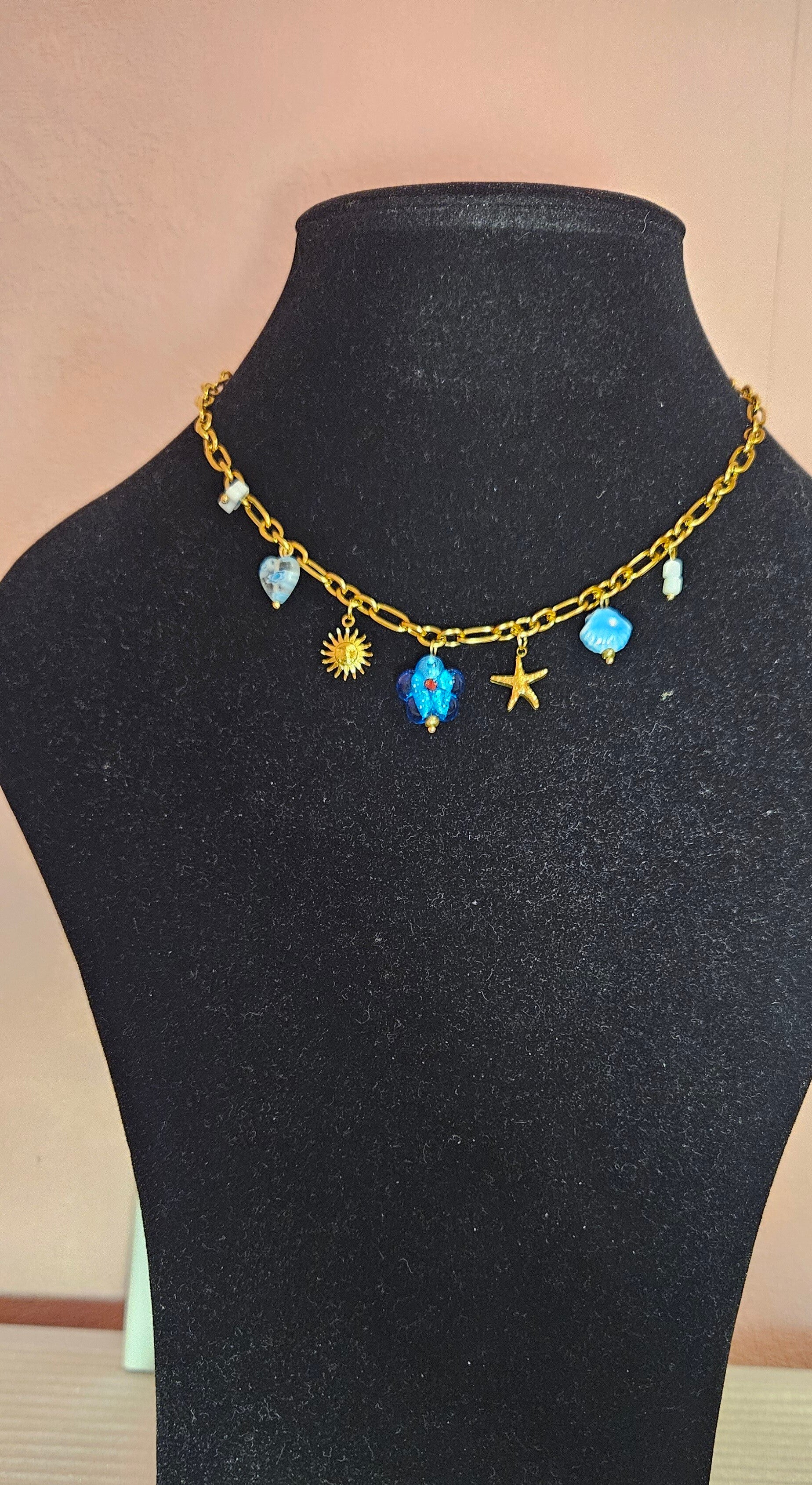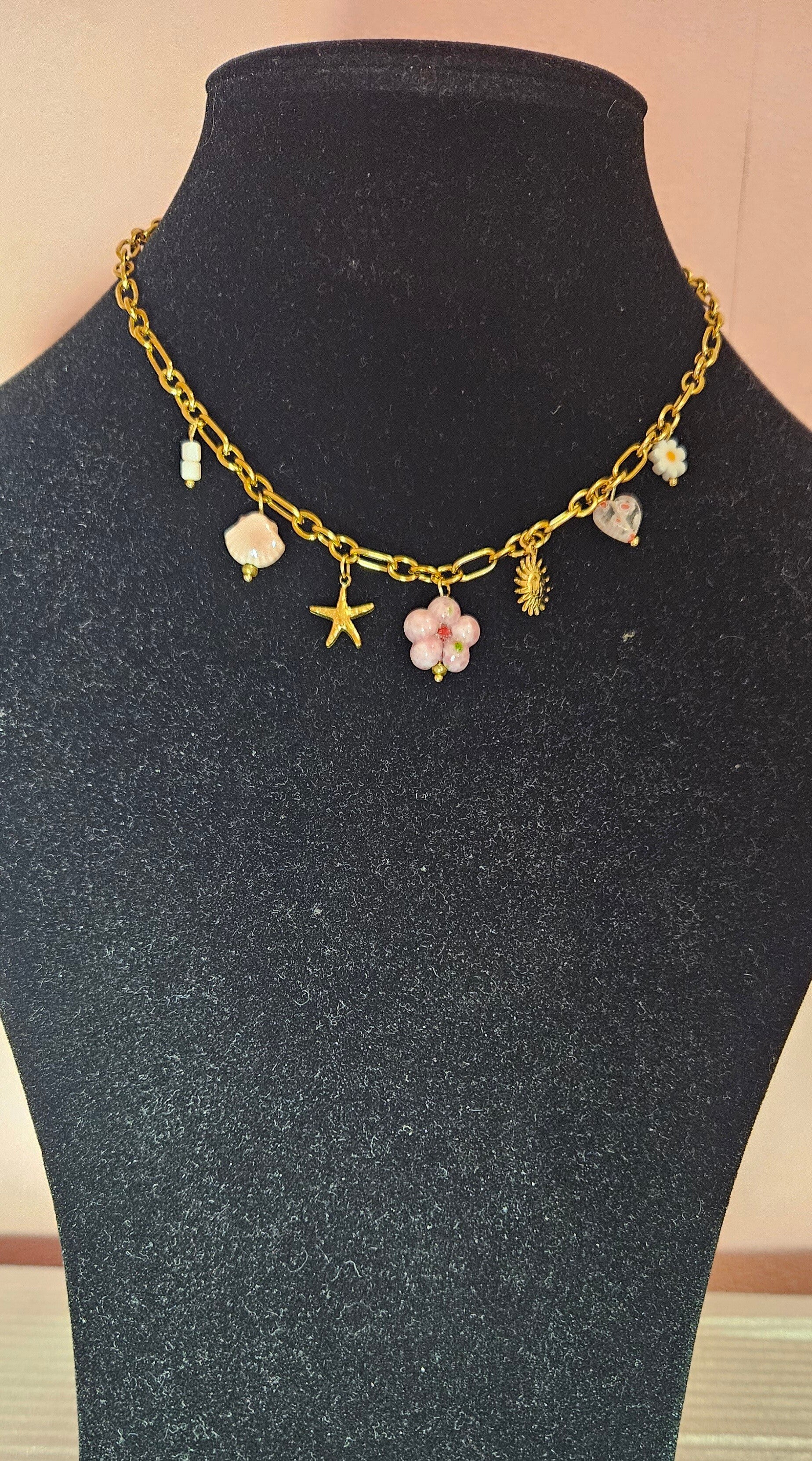 ✨️ Apportez une touche ensoleillée à votre look avec ce collier doré orné de breloques colorées. Il mêle élégance et fantaisie avec des charms en verre soufflé, métal doré et émail. Parfait pour les beaux jours ou pour illuminer vos tenues toute l’année.✨️