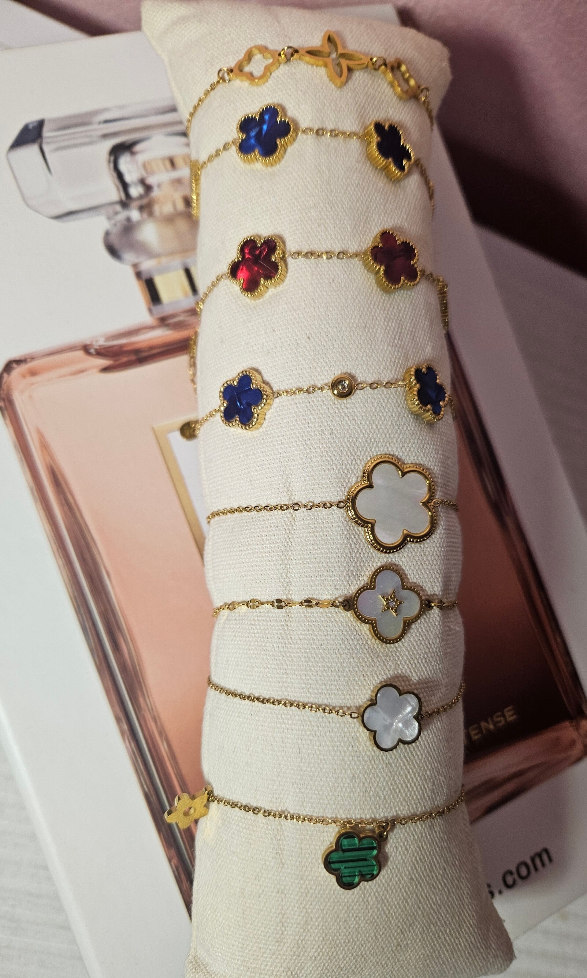✨️ Sublimez votre poignet avec cette gamme de bracelets dorés, inspirée des grandes maisons, chaînes fines et raffinées ornées de trèfles élégants. Disponible en bleu marbré, rouge marbré, blanc nacré ou vert, chaque bracelet apporte une touche unique et raffinée à votre style.✨️
