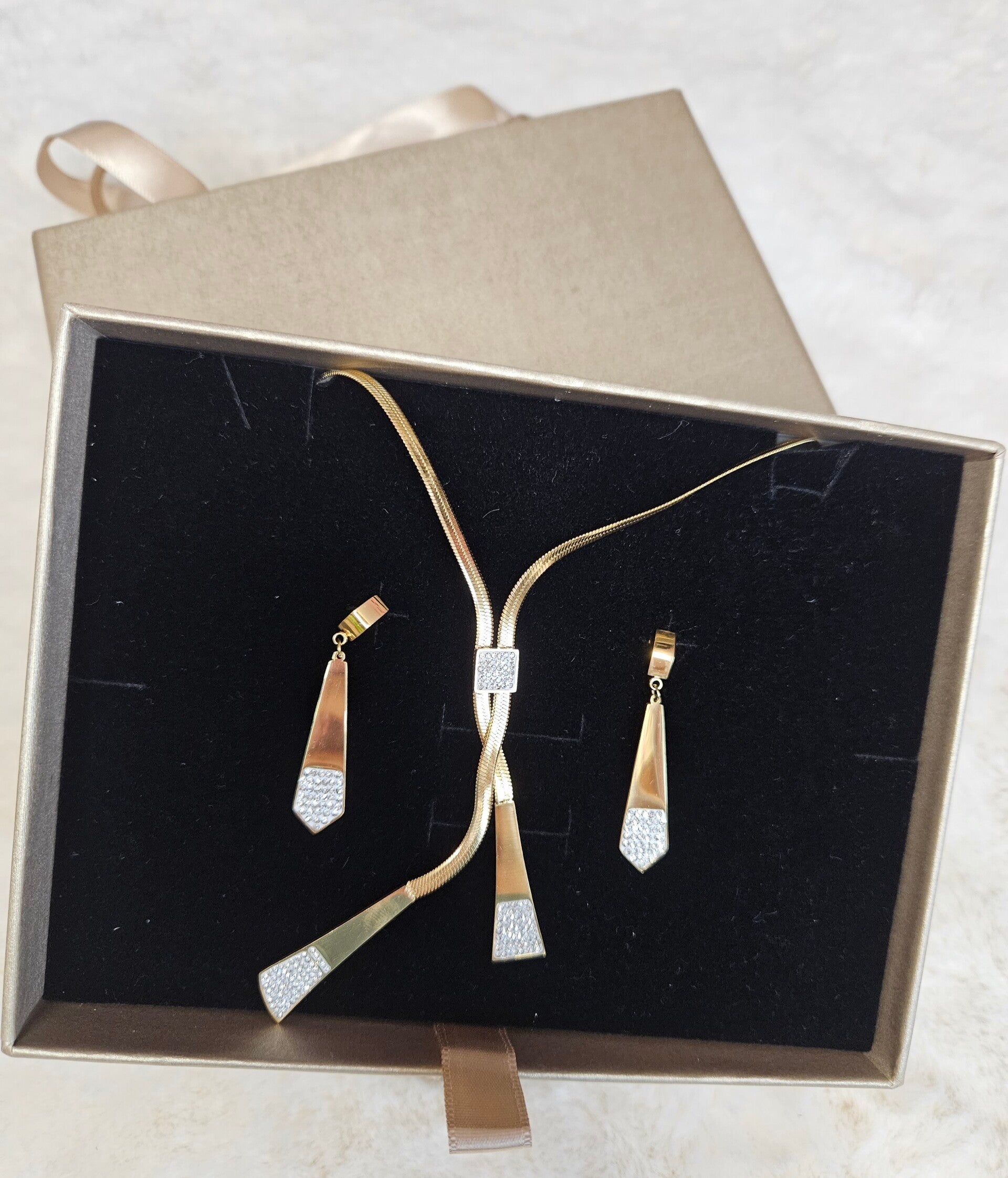 ✨️ Élégante et scintillante, la Parure Cravate séduit par son design raffiné et son éclat doré.
