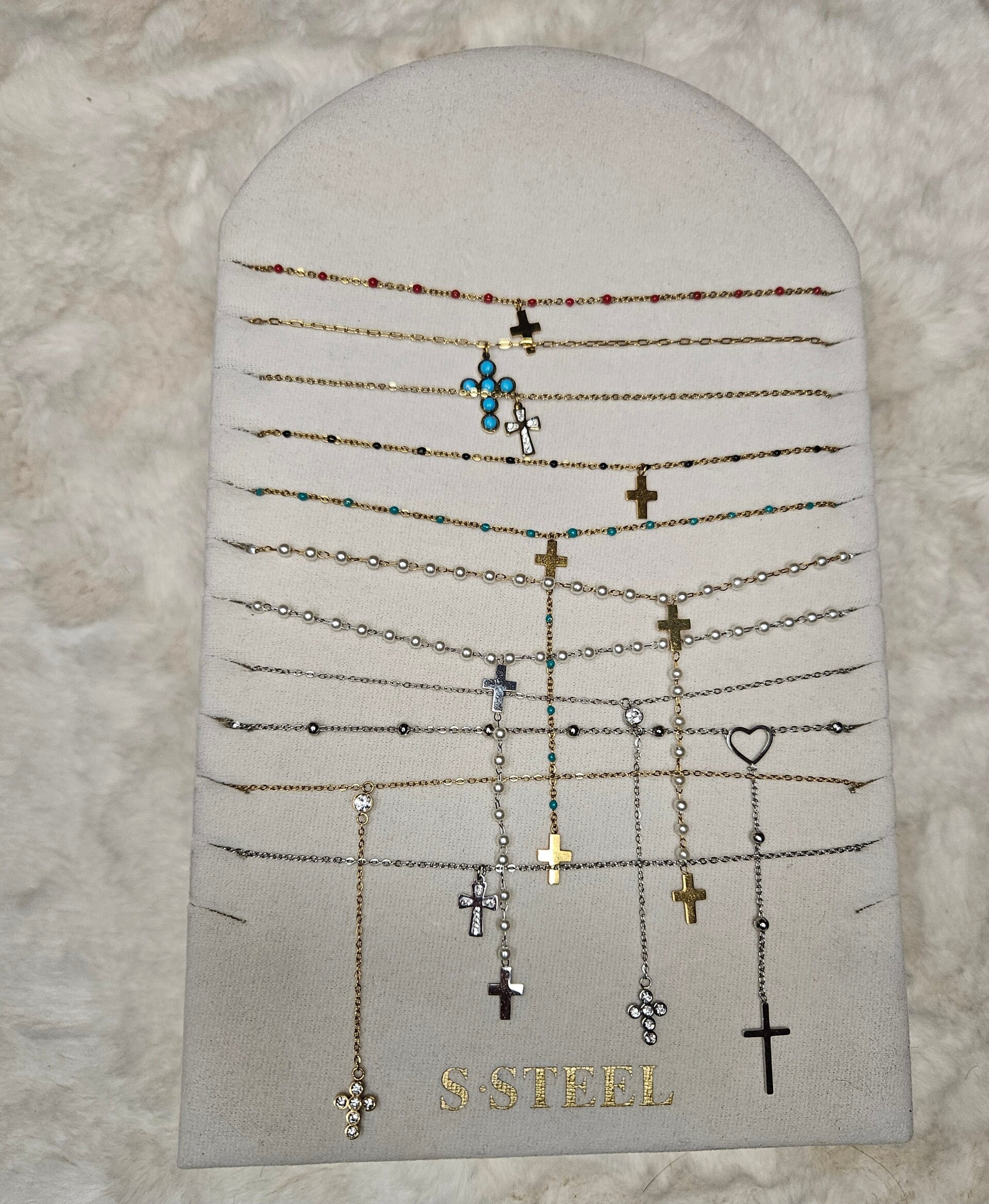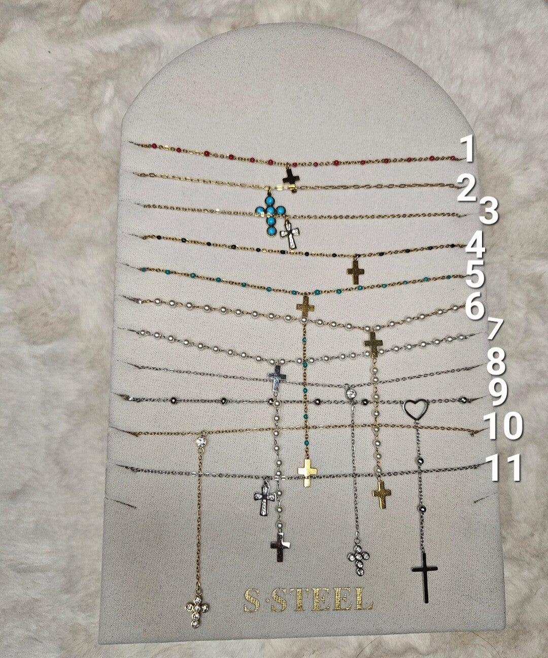 ✨️ Des colliers délicats en doré ou argenté, disponibles en Y ou en version simple, tous ornés de petites croix et de perles colorées ou nacrées.