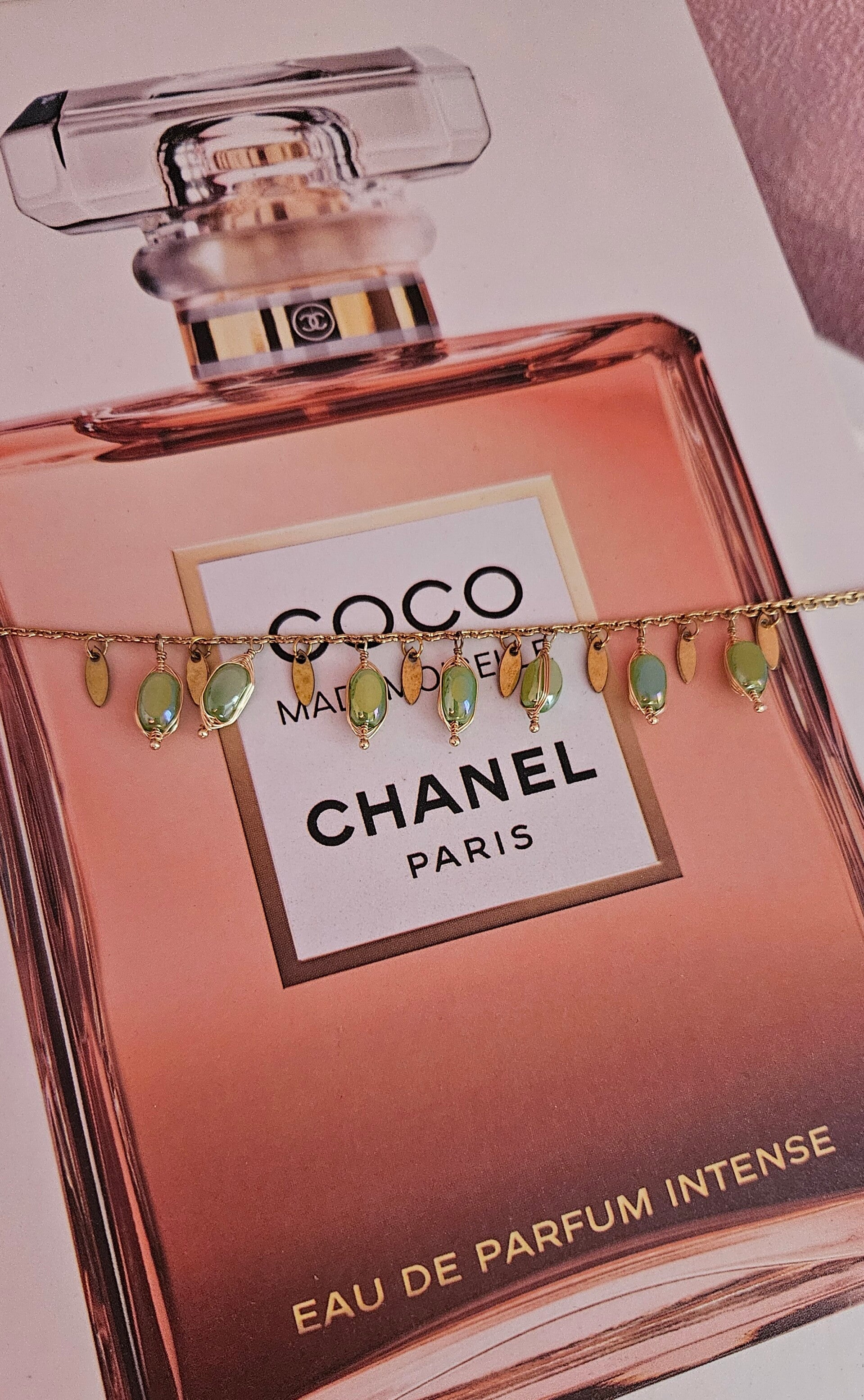 Élégante chaîne dorée ornée de nombreuses pampilles en forme de gouttes vert émeraude, un bijou délicat et lumineux.