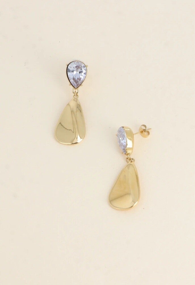 Boucles d'oreilles pendantes en acier inoxydable composées d'un cristal en forme de goutte et d'un empiècement en forme de goutte.