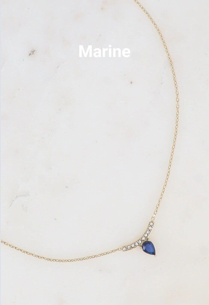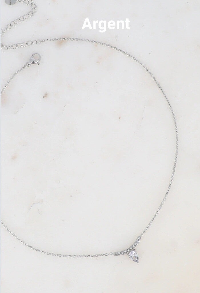 ✨️ Collier sur chaîne en acier inoxydable composé d'un pendentif en forme de petite barre courbée sertie d'oxydes de zirconium et d'un cristal taillé en forme de goutte inversée.✨️