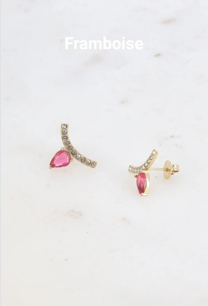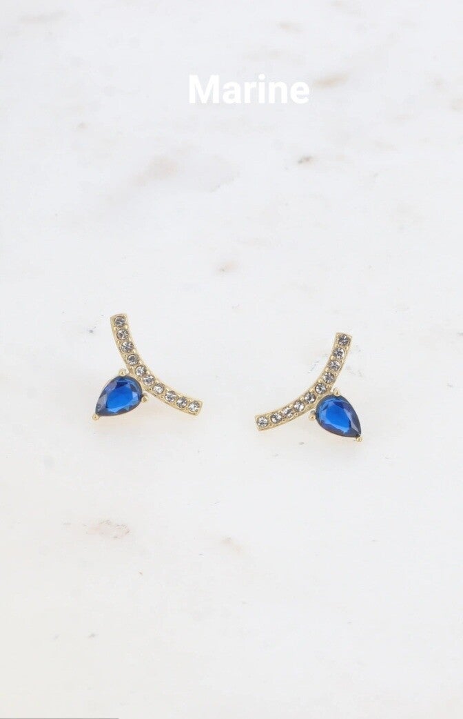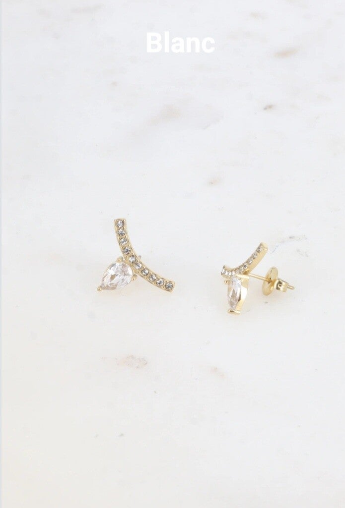 ✨️Boucles d'oreilles à puce en acier inoxydable composées d'un motif en forme de petite barre courbée sertie d'oxydes de zirconium et d'un cristal taillé en forme de goutte inversée.✨️