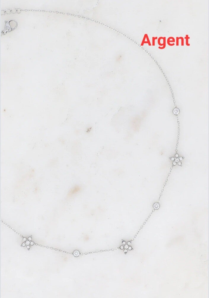 Collier sur chaîne en acier inoxydable composé de trois fleurs serties d'oxydes de zirconium et de quatre oxydes de zirconium.