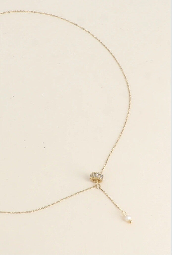 Collier en Y sur chaîne en acier inoxydable composé d'un anneau orné de cristaux et une chaîne pendante ornée d'une perle d'eau douce.