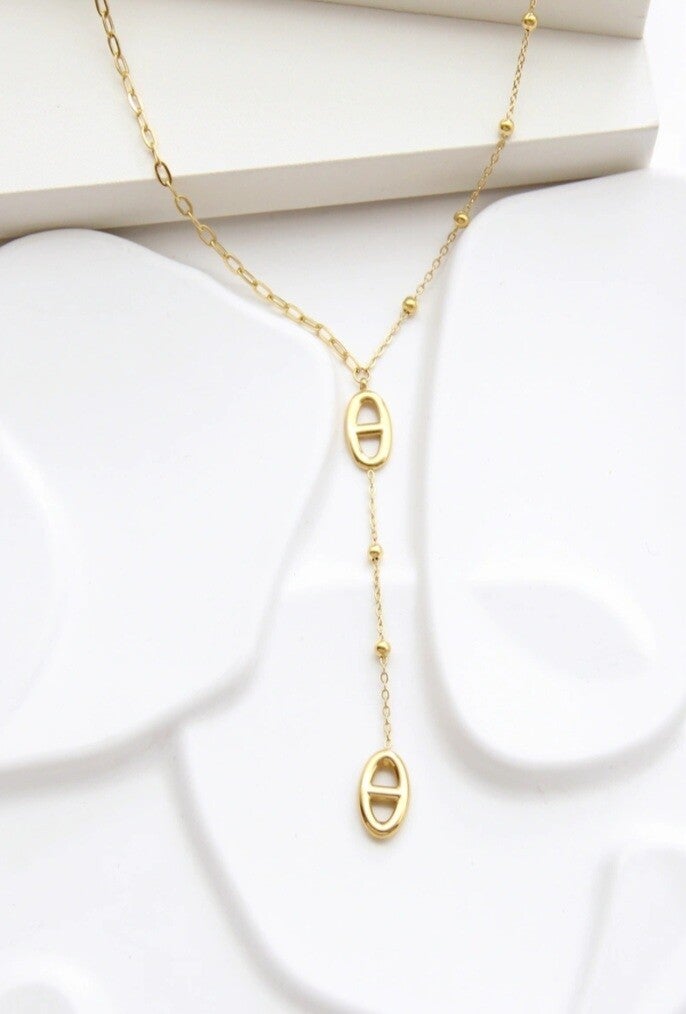 Ce collier asymétrique séduit par son design géométrique et raffiné, alternant maillons fins et petites perles dorées ou argentées selon la version. En son centre, deux maillons ovales ajourés apportent une touche contemporaine et structurée.