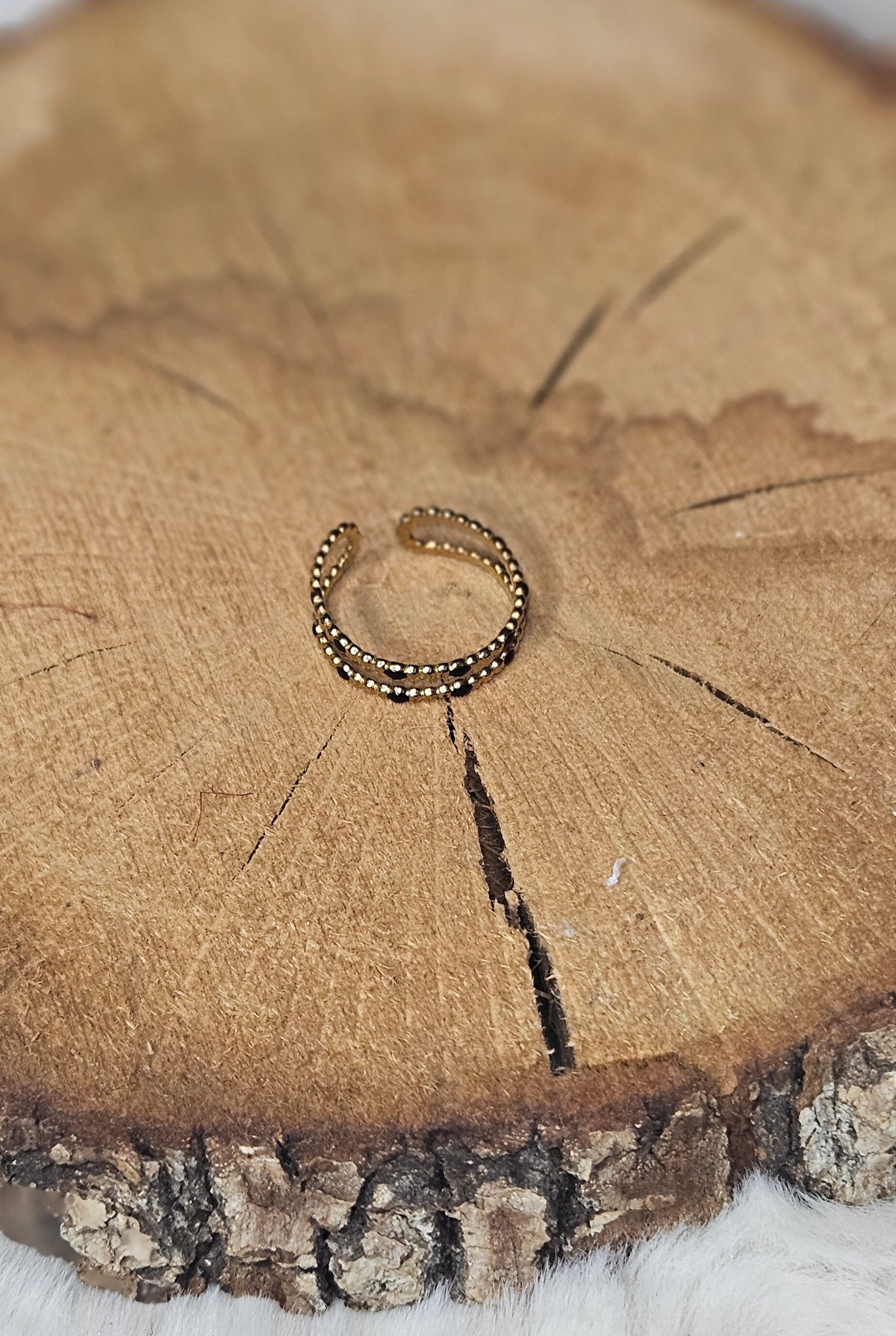 Bague dorée à deux rangs de petites perles, disponible en blanc ou noir.