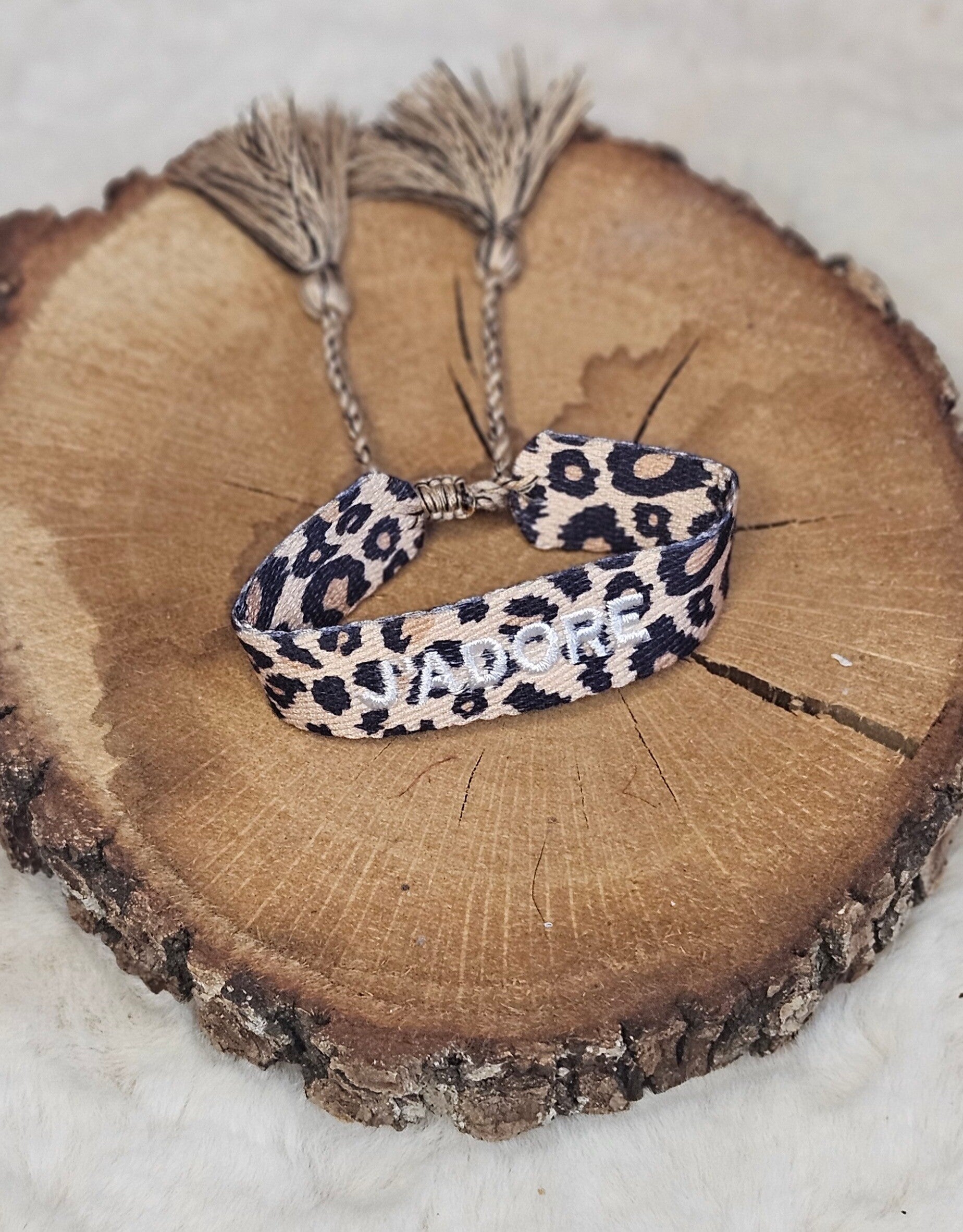 ✨ Bracelet tissu brodé “J’adore” – Léopard & pompon ✨️