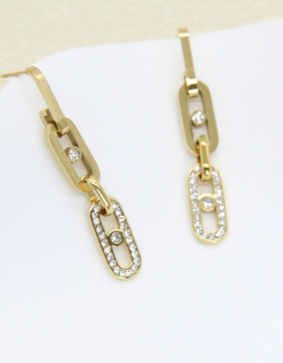 Boucles d’oreilles modernes en acier inoxydable ornées de maillons rectangulaires sublimés par des strass scintillants. Un modèle chic et lumineux, parfait pour apporter une touche sophistiquée à toutes vos tenues.
