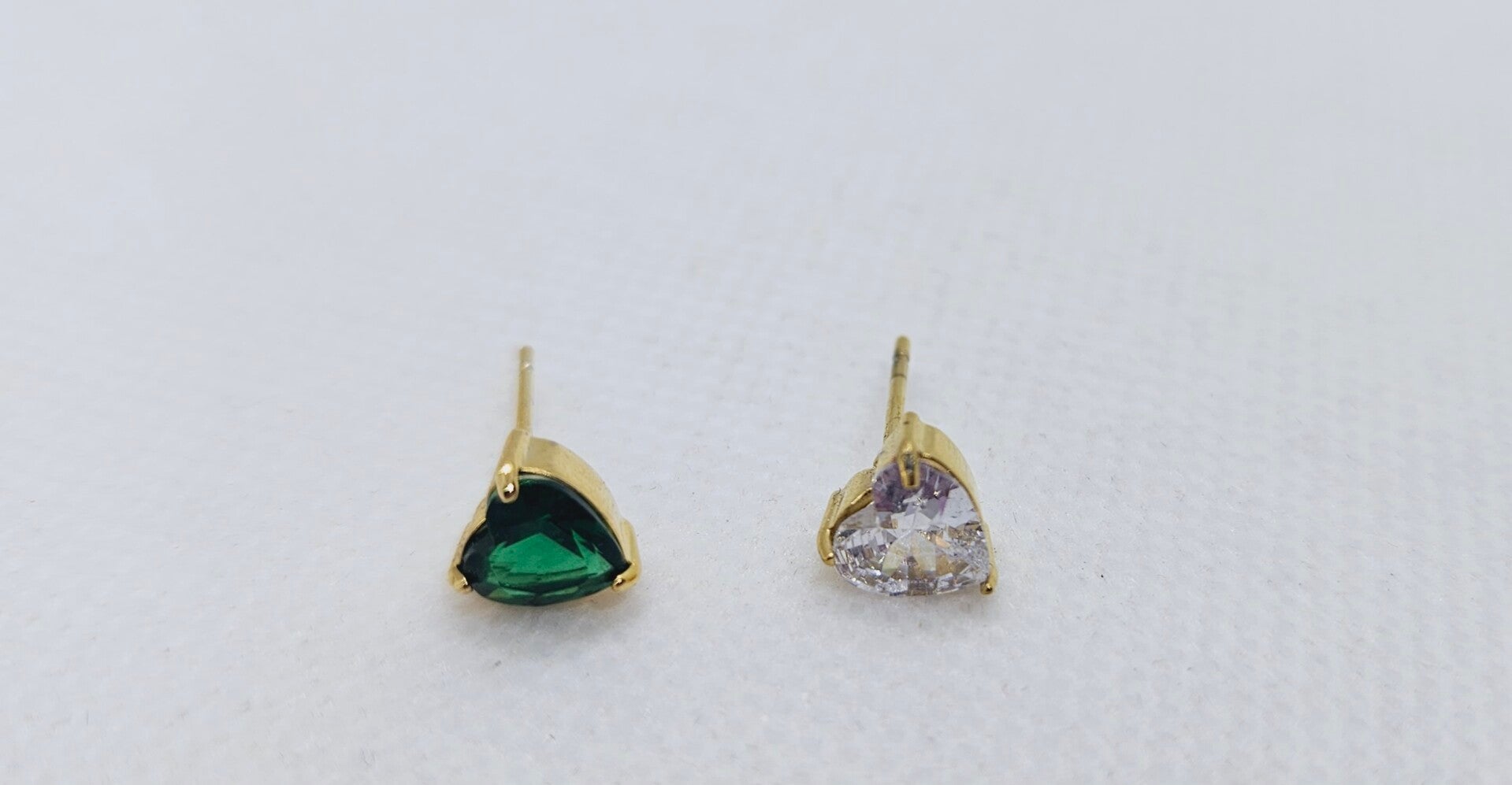 « Superbes petites boucles d’oreilles en forme de cœur, dorées et en métal oxydable. Deux modèles disponibles : l’un avec un cœur rose délicat, et l’autre original tricolore avec un cœur vert sur une boucle et un cœur blanc sur l’autre. »