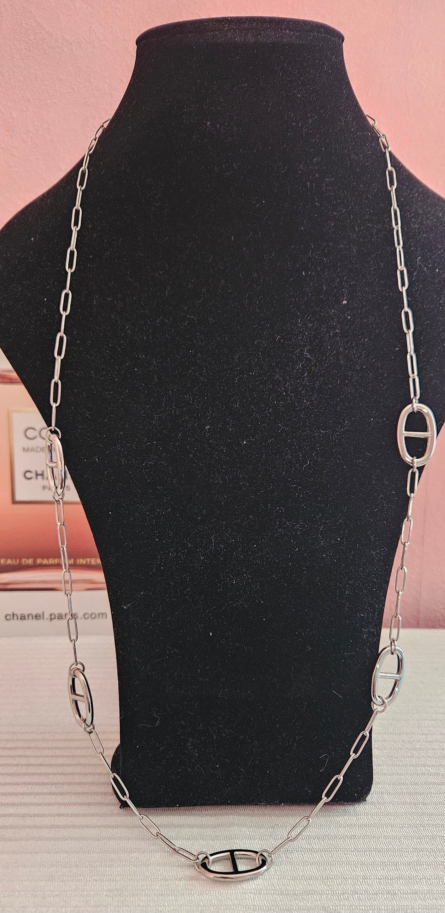 Élégant et intemporel, ce sautoir doré se distingue par son design structuré et raffiné. Il est composé de cinq mailles marines, dont une maille centrale plus large, apportant caractère et équilibre à l’ensemble.