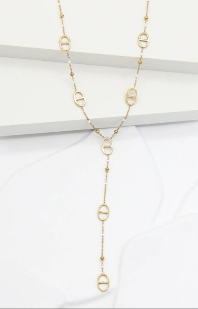Élégant et tendance, ce collier Y en acier inoxydable doré revisite le style marin avec de délicates boucles ovales “maillon marine” reliées par une fine chaîne dorée. Son design en Y allonge le cou et sublime le décolleté avec une touche raffinée et moderne.
