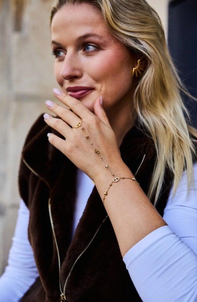 Ce bracelet de main élégant associe la finesse d’une chaîne dorée en acier inoxydable aux maillons emblématiques de la maille marine. De délicates perles rondes et des zircons étincelants viennent rehausser son éclat, offrant un bijou raffiné et moderne. Conçu pour relier le poignet au doigt avec légèreté, il habille la main d’un style chic et sophistiqué, idéal pour un look quotidien tendance ou une occasion spéciale. Acier inoxydable doré, résistant et hypoallergénique Maillons marins et perles dorées en relief Zircons scintillants pour une touche lumineuse Chaîne ajustable pour un confort parfait Un bijou original et raffiné qui souligne la beauté naturelle de vos mains.