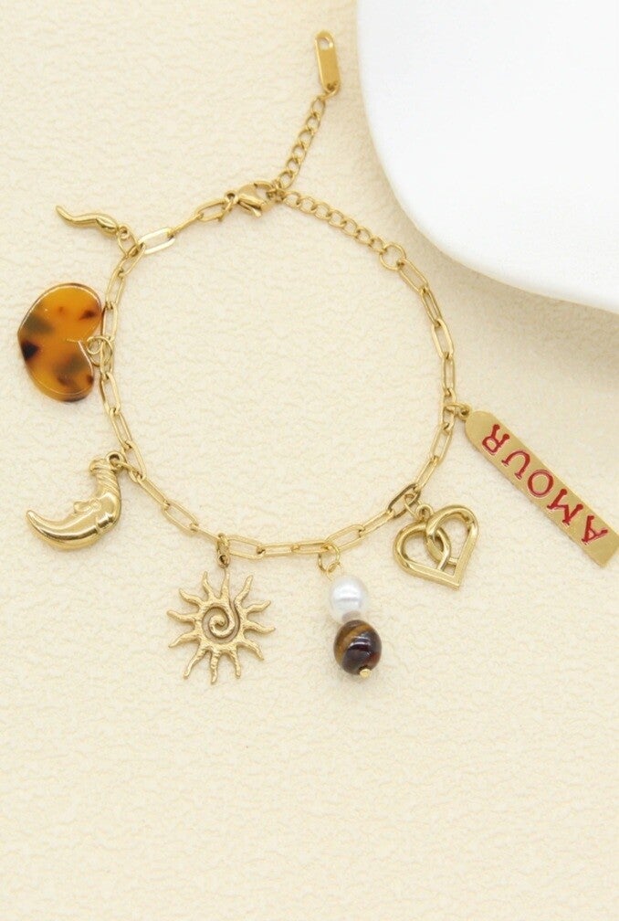 Craquez pour ce collier tendance composé d’une chaîne maille allongée dorée sublimée par une sélection de charms symboliques : cœur ajouré, pastille “AMOUR”, soleil, perle et pierre naturelle, corne porte-bonheur et cœur effet écaille.