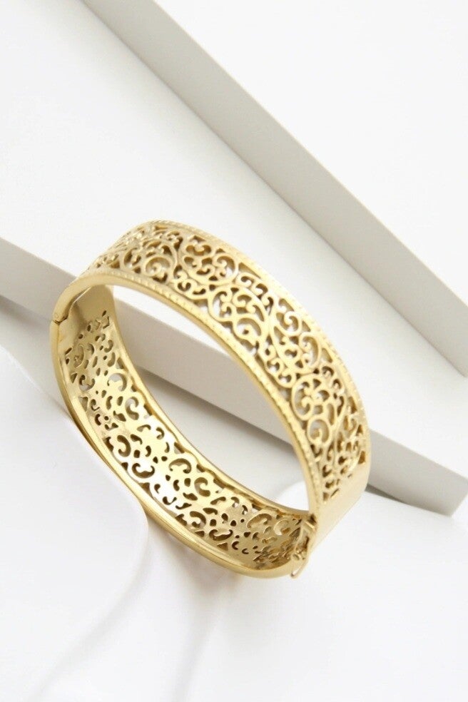 Ce bracelet jonc ajouré en acier inoxydable doré séduit par son motif dentelle finement travaillé, évoquant l’élégance intemporelle et la féminité raffinée.