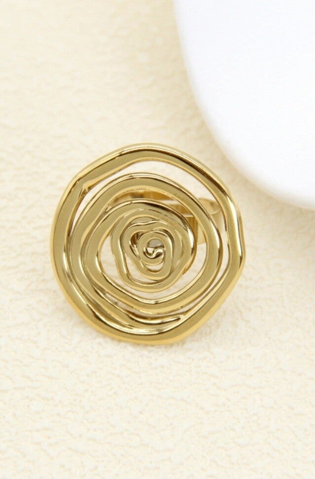 Optez pour l’élégance contemporaine avec cette bague spirale en acier inoxydable doré, un modèle graphique et sophistiqué qui attire instantanément le regard.
