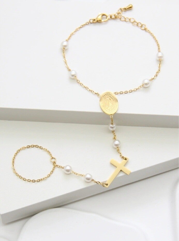 Un bijou raffiné au style spirituel et élégant. Ce bracelet de main est réalisé en acier inoxydable doré et orné d’une médaille religieuse ovale et d’une croix délicate. La chaîne fine est ponctuée de petites perles blanches qui apportent une touche de douceur et de luminosité. Acier inoxydable doré, durable et hypoallergénique Médaille et croix finement travaillées Détails en perles blanches élégantes Chaîne ajustable pour un confort optimal Un accessoire intemporel qui allie foi, élégance et modernité, parfait pour un style unique et symbolique.