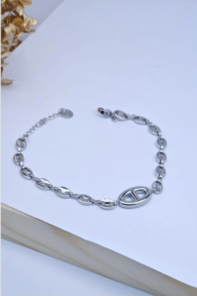 "Bracelet grain de café en doré ou argenté, délicatement travaillé avec une maille marine. Une pièce chic et tendance, parfaite pour apporter une touche raffinée à votre poignet."