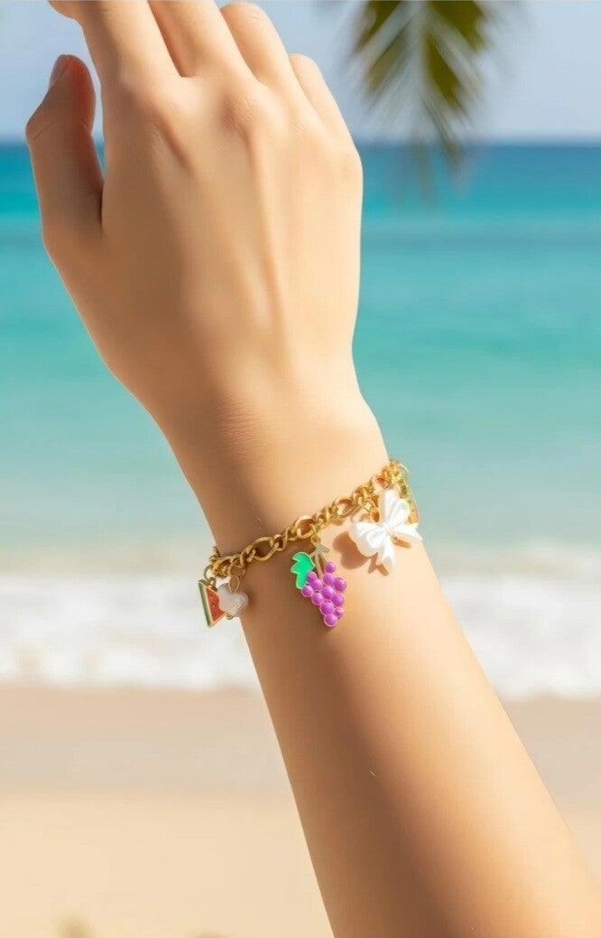 Apportez une touche ludique et colorée à votre poignet avec ce bracelet doré en acier inoxydable, orné de nombreux pendentifs breloques en forme de fruits. Ajustable et léger, il se porte seul pour un style fun ou en superposition pour un look tendance et original.