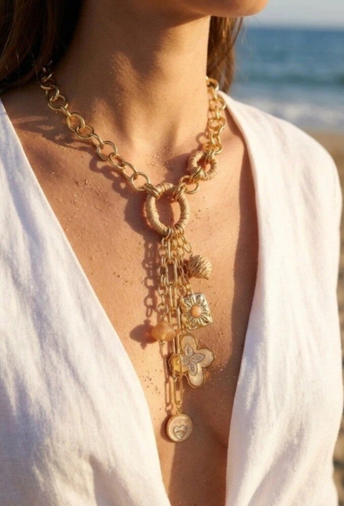 Laissez-vous séduire par ce superbe collier maxi breloques, orné de plein de breloques différentes qui font toute la différence. Véritable bijou statement, il attire tous les regards et transforme instantanément n’importe quelle tenue.