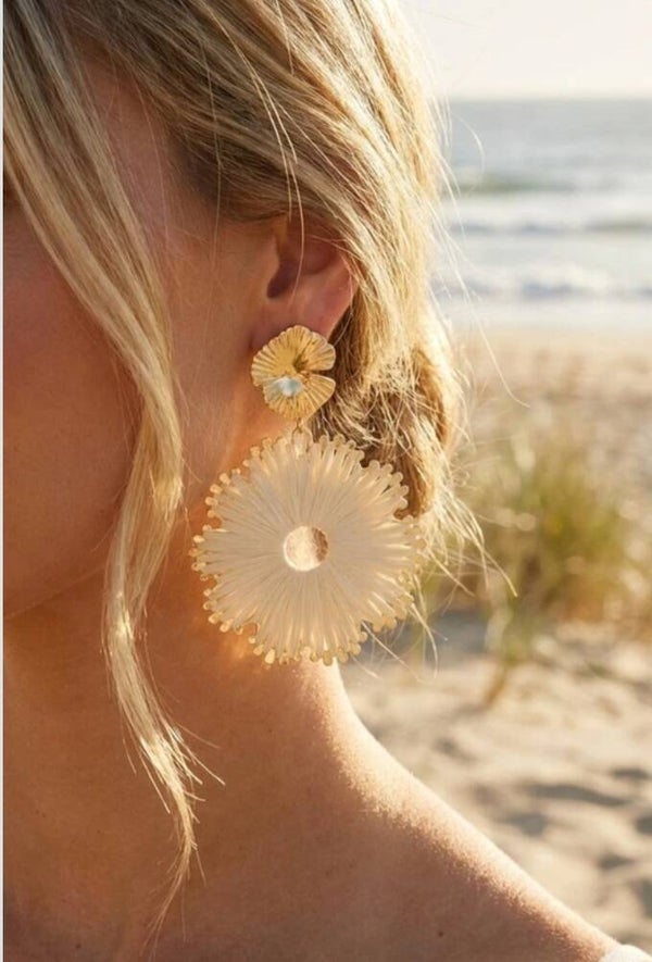 Ces boucles d’oreilles dorées se distinguent par leur grande forme pendentif spectaculaire, sublimée par des couleurs vibrantes et lumineuses qui sentent bon le printemps et l’été 🌸🍊🌊