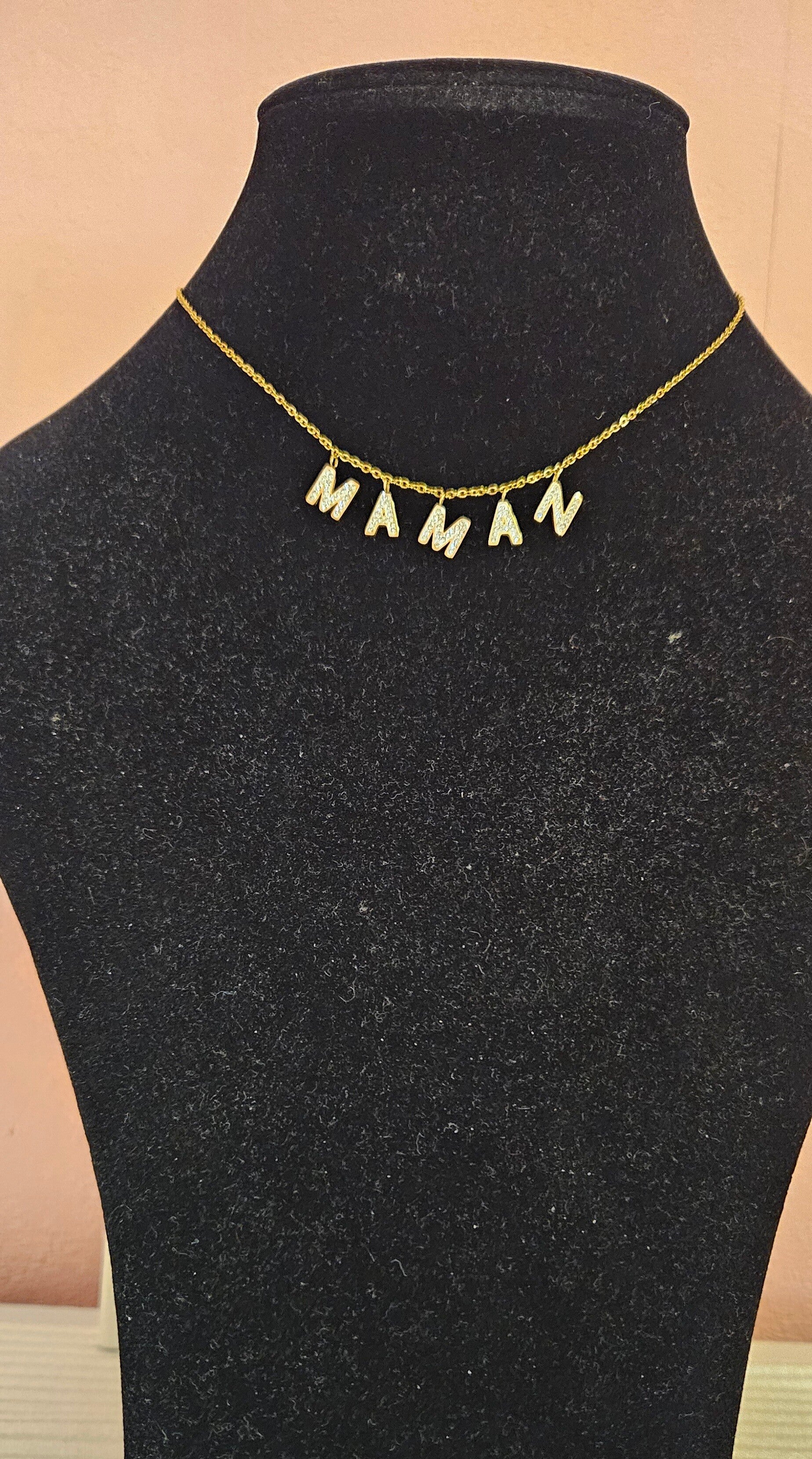 Magnifique collier chaîne dorée – Pendentif “Maman” en strass ✨