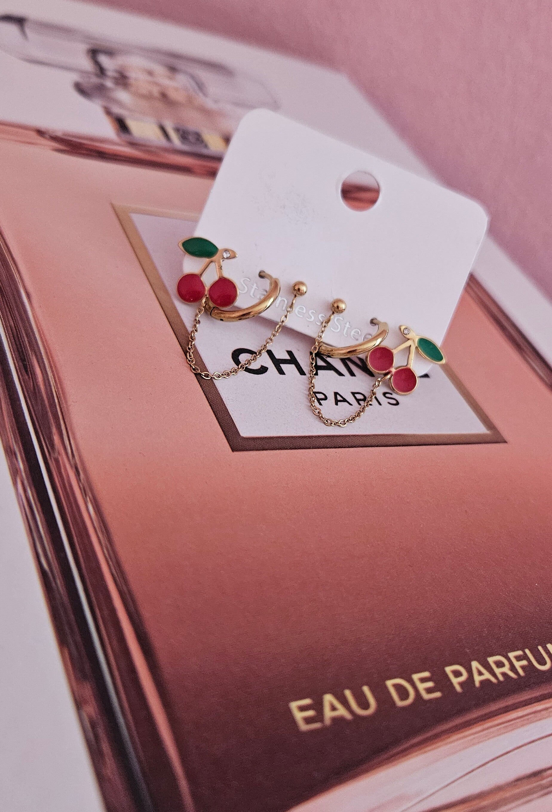 Duo de boucles d’oreilles : une petite créole dorée et une boucle cerise avec délicate chaînette. Nécessite trois perçages pour porter l’ensemble. Disponible en doré, en acier inoxydable. »