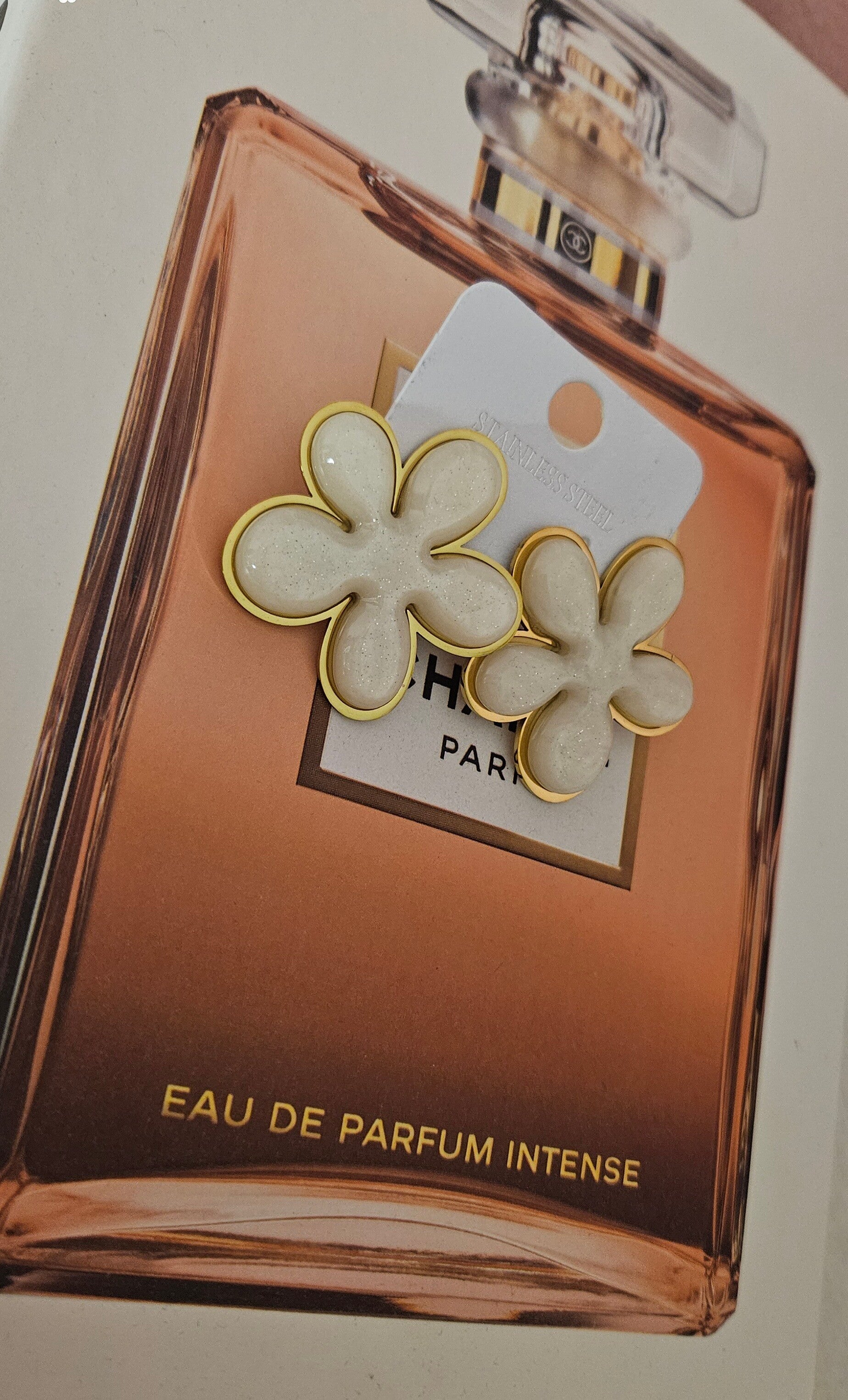 Craquez pour cette magnifique paire de boucles d’oreilles en forme de fleurs composée de cinq pétales délicats au coloris blanc crème subtilement pailleté. Un bijou lumineux, raffiné et plein de charme qui attire immédiatement le regard.