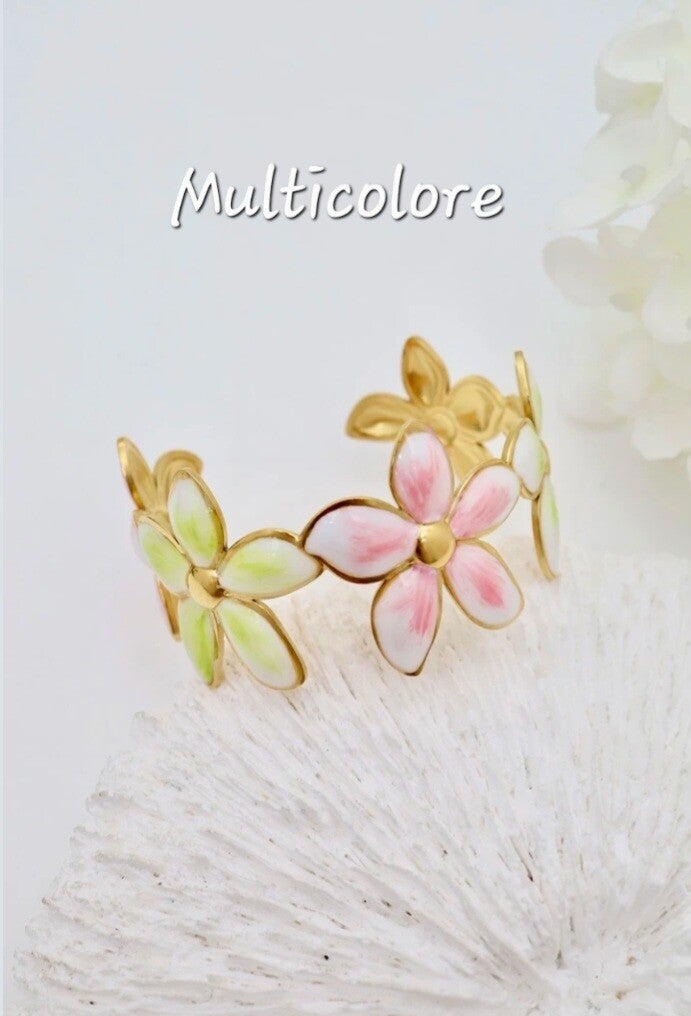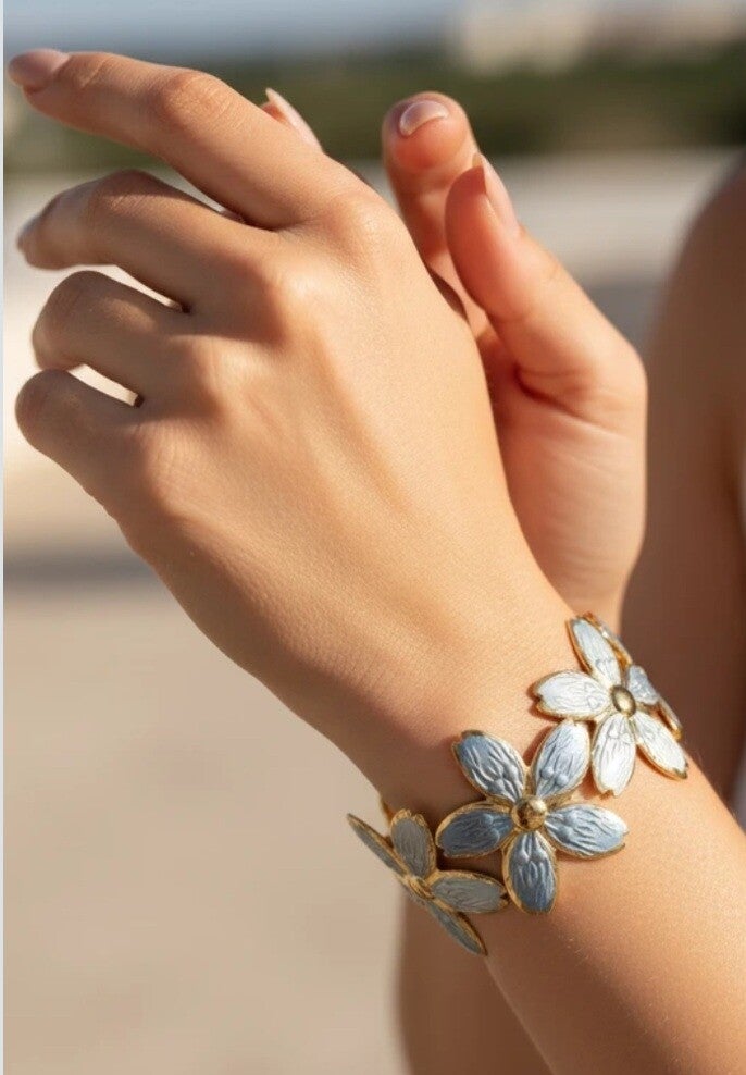 Laissez-vous envoûter par ces manchettes larges délicatement fleuries, où les couleurs pastel du printemps et de l’été dansent avec légèreté. Chaque fleur est un petit éclat de beauté qui illumine votre poignet. ✨