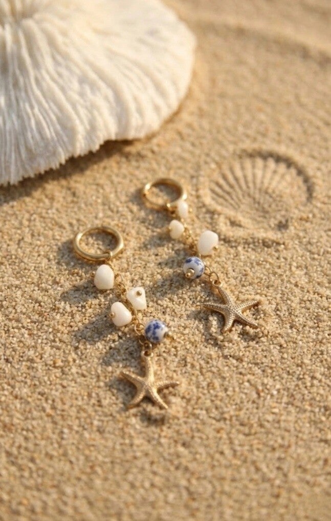 Craquez pour ces magnifiques petites créoles dorées, ornées de pampilles et de perles, inspirées de l’été et des vacances 🌴