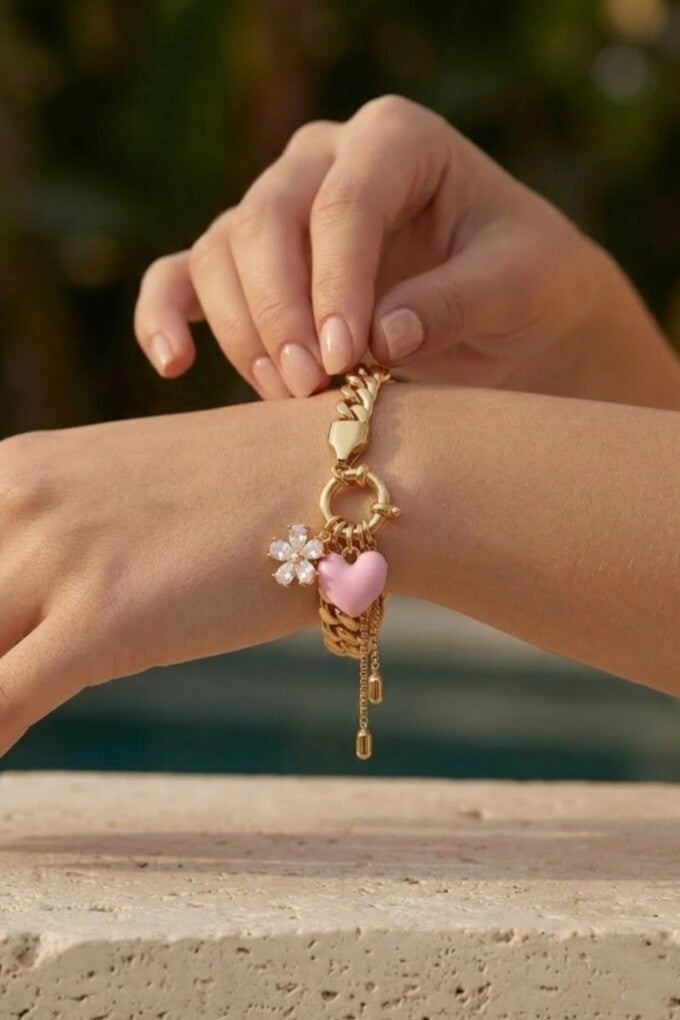 ✨️Succombez au charme de ce bracelet charms cœur en acier inoxydable doré, sublimé par un pendentif cœur rose et une délicate fleur scintillante. Son design chic et féminin apporte une touche romantique et tendance à votre poignet. Résistant et lumineux, il est parfait pour illuminer vos looks avec élégance au quotidien.✨️