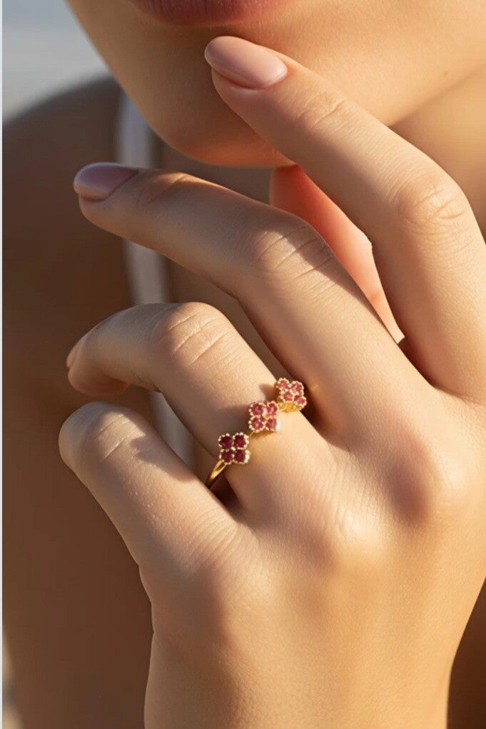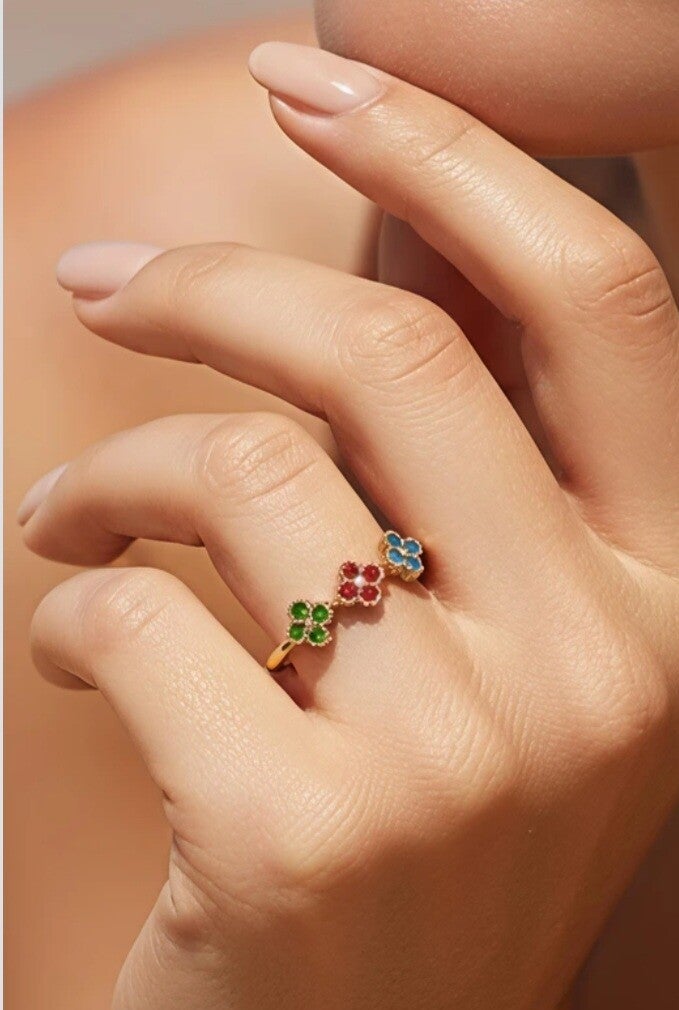 "Découvrez la magnifique bague Princesse : trois fleurs délicates ornées de zircons aux deux couleurs, en acier inoxydable et ajustable pour un confort parfait."