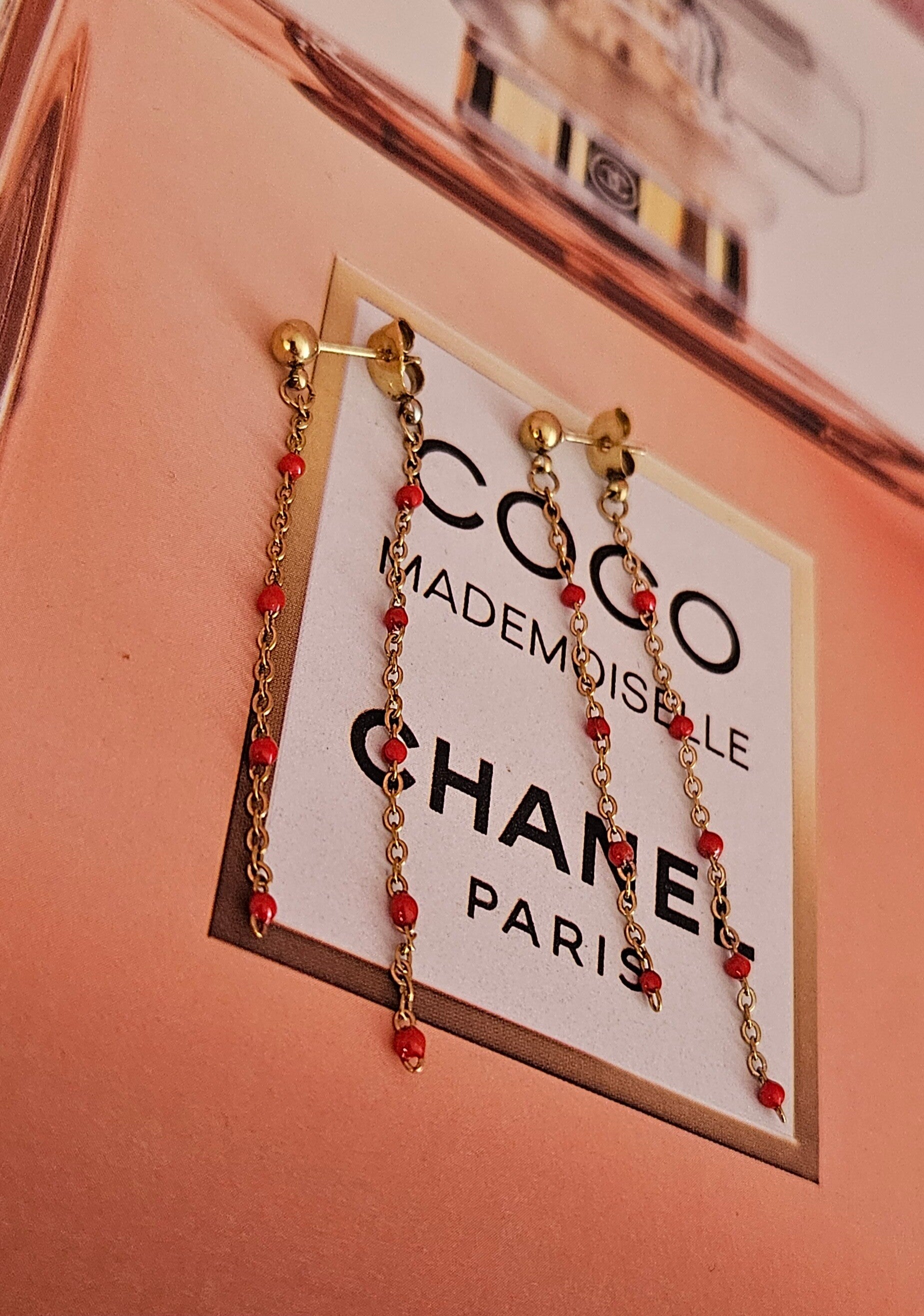 ✨ Boucles d’oreilles pendantes dorées avec perles rouges ❤️